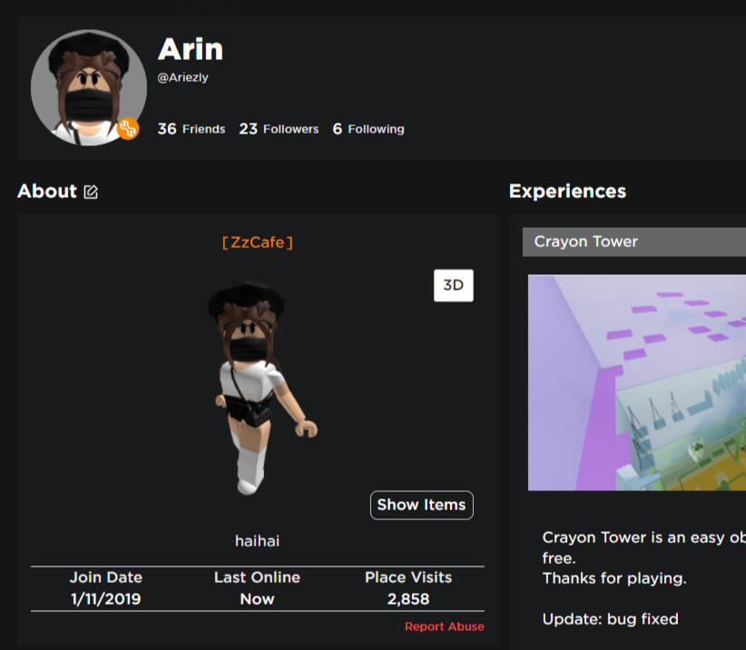 This is my Roblox Profile so don't get me wrong haha! I enjoy spending my time on Roblox Studio instead of playing games. I am a obby game creator which is called Crayon Tower, I'm currently working on a vibing Cafe game so stay turned for it.
